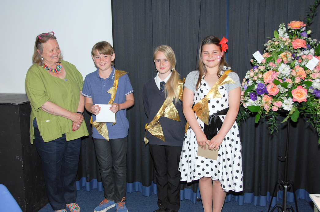 the winners : Sammy Roy, Alice Walkey and Tegan Farquharson with Councillor Ros Lester